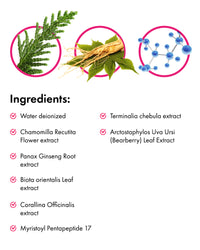 Aqua, Glycerin, Propanediol, Panthenol, Cocodimonium Hydroxypropyl Hydrolyzed Wheat Protein, Biotinoyl Tripeptide-1, Butylene Glycol, Centella Asiatica Extract, Myristoyl Pentapeptide-17, Polygonum Cuspidatum Root Extract, Scutellaria Baicalensis Root Extract, Camellia Sinensis Leaf Extract, Glycyrrhiza Glabra (Licorice) Root Extract, Chamomilla Recutita (Matricaria) Flower Extract, Rosmarinus Officinalis (Rosemary) Leaf Extract, Phenoxyethanol, Xanthan Gum, Ethylhexylglycerin.